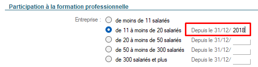Vérifier dans un premier temps l'effectif de l'entreprise et la date renseignée correspondante dans la fiche Société pour la participation à la formation professionnelle. La date indiquée doit toujours correspondre à l'année N-1. Par conséquent, le franchissement du seuil débute le 1er janvier de l'année suivante :