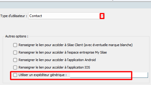 Sélectionner ensuite le type d'utilisateur Contact dans le menu déroulant et dans Autres options cocher la case "Utiliser un expéditeur générique" sans modifier l’adresse mail qui se préremplit :