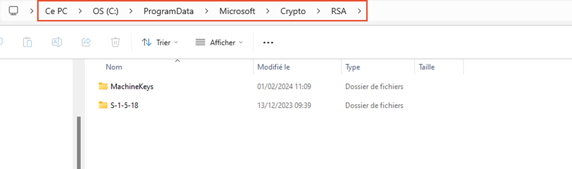 Ouvrir l'explorateur de fichier et renseigner dans la barre des tâches C:\ProgramData\Microsoft\Crypto\RSA :