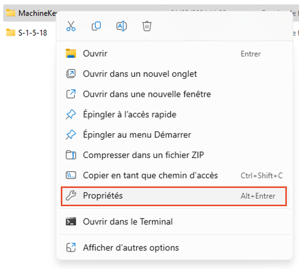 Sur le dossier "MachineKeys", effectuer un clic droit et sélectionner "Propriétés" :