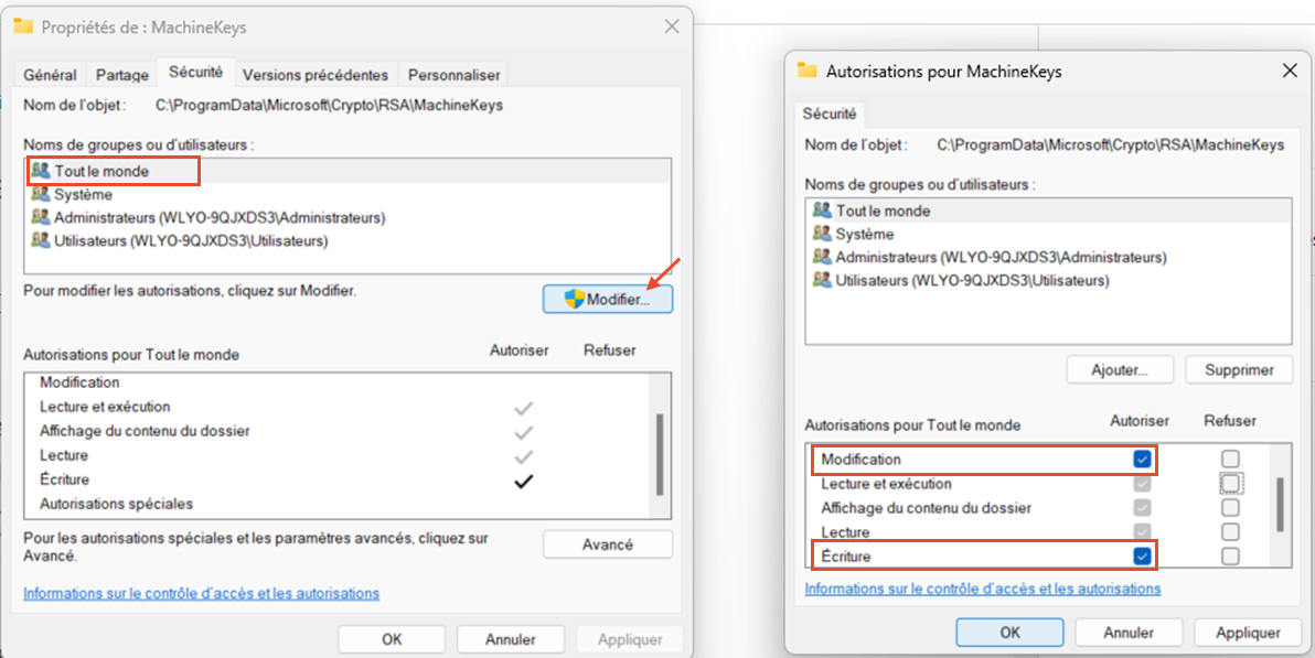 Dans ce cas, il est nécessaire d'attribuer les droits en modification/écriture du dossier au MachineKeys nécessaire au bon fonctionnement du logiciel (C:\ProgramData\Microsoft\Crypto\RSA\MachineKeys).