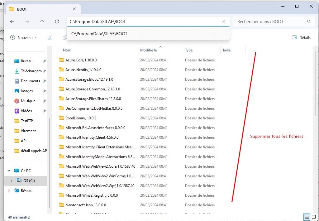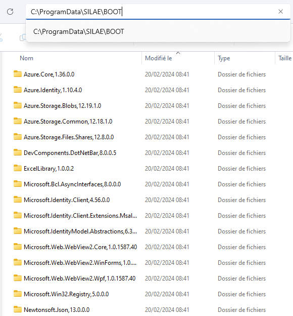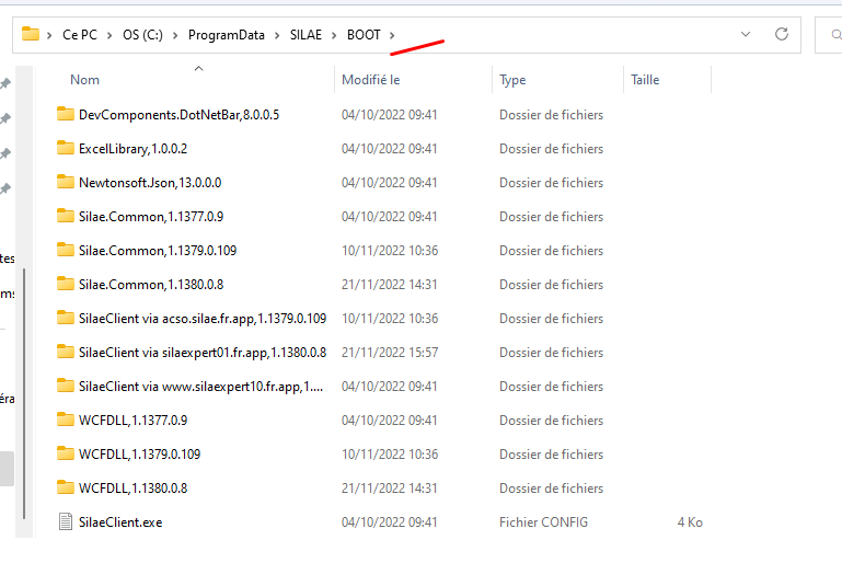 Le dossier d'installation des fichiers du logiciel se situe dans le répertoire suivant : C:\ProgramData\SILAE\BOOT :