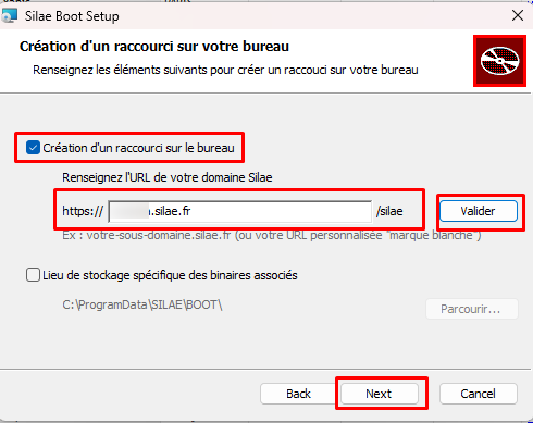 d. Activer ensuite la coche "Création d’un raccourci sur le bureau". Saisir l’URL de la plateforme souhaitée c’est-à-dire xxxx.silae.fr puis cliquer sur "Valider". Cliquer ensuite sur "Next" :