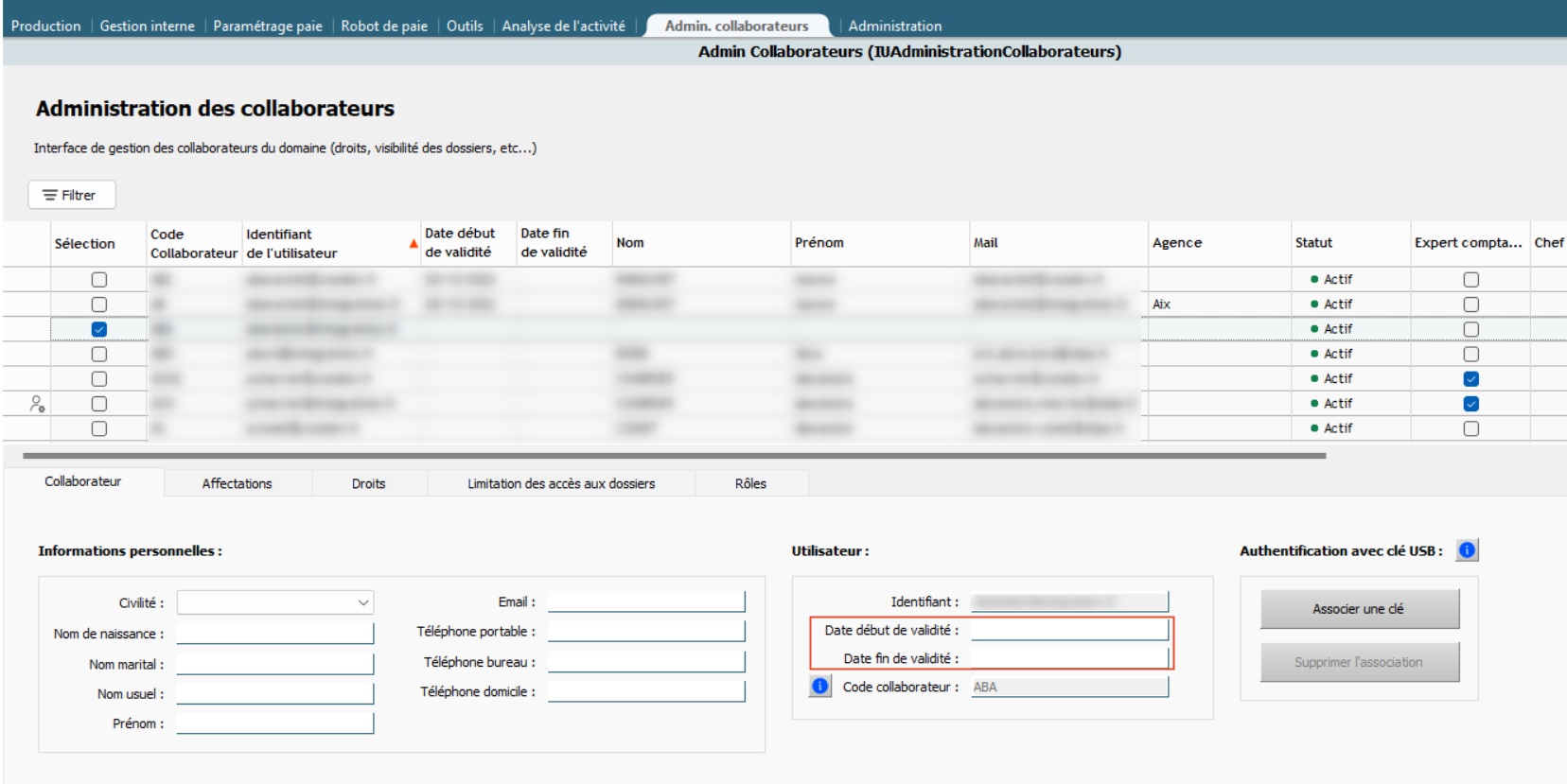 Il s'agit donc de demander à l'administrateur du domaine ou au responsable social de se rendre dans l'onglet Admin. collaborateurs afin de vérifier si la date saisie n'est pas supérieure à la date actuelle. Si c'est le cas, la date de début d'activité doit être adaptée pour activer l'identifiant.