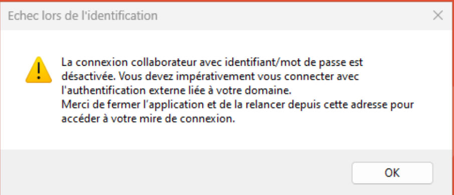 - L'utilisateur tente de se connecter en utilisant son identifiant et mot de passe alors que l'authentification externe du dossier est activée et que la connexion par authentification est requise ;