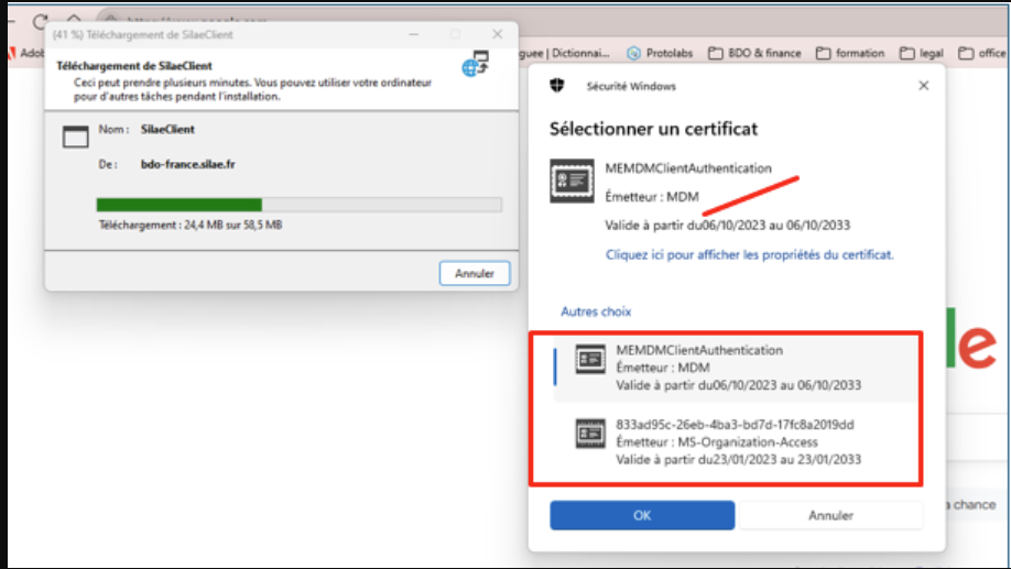 Silae dispose de son propre certificat. Lors de la tentative d'ouverture, un certificat sans lien avec le nôtre tente de s’installer sur votre poste, provenant de leur configuration Windows/poste.