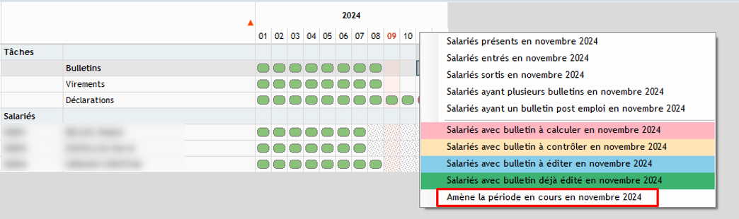 Depuis l'État d'avancement, réaliser un clic droit sur la bulle "Bulletins" qui correspond au mois de génération des bulletins complémentaires puis, sélectionner "Calculer des bulletins post-emploi" :