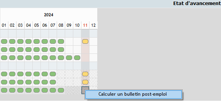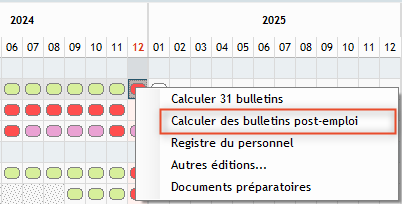 Pour calculer un bulletin post-emploi, faire un clic droit sur la case vide. Il est aussi possible de calculer des bulletins post-emploi en masse.