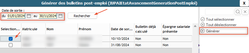 Indiquer une période sur laquelle rechercher des sorties et sélectionner les salariés concernés par la génération d'un bulletin post-emploi. Cliquer ensuite sur "Générer" :
