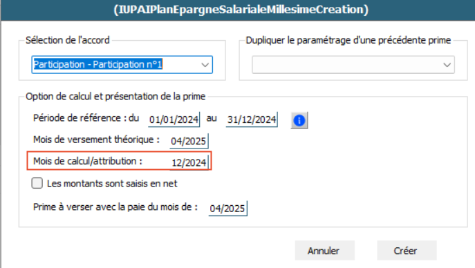 Au moment de la création de la prime, renseigner le mois de rattachement souhaité dans l'encadré "Mois de calcul/attribution" :