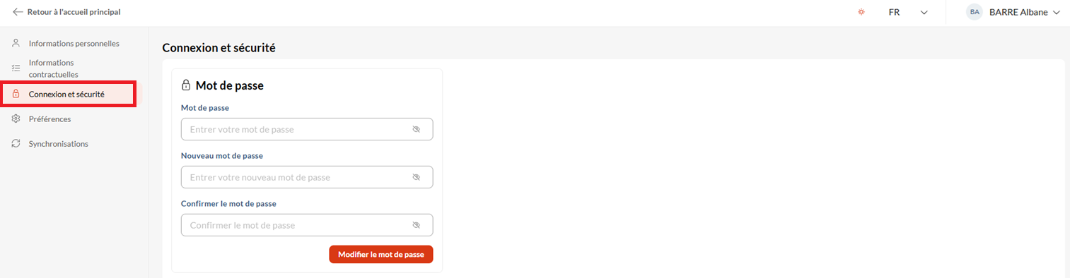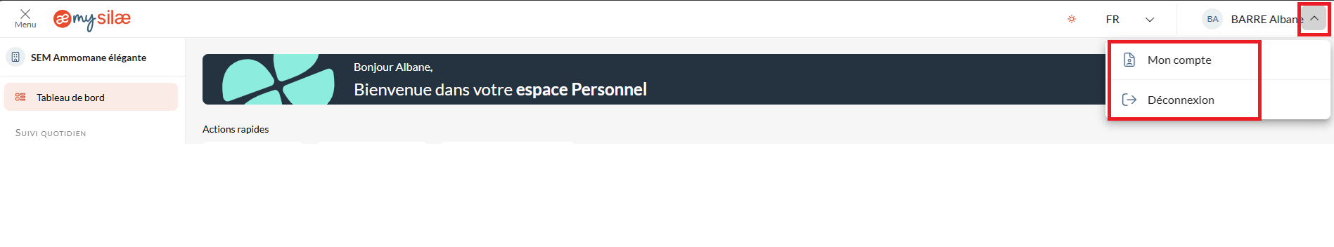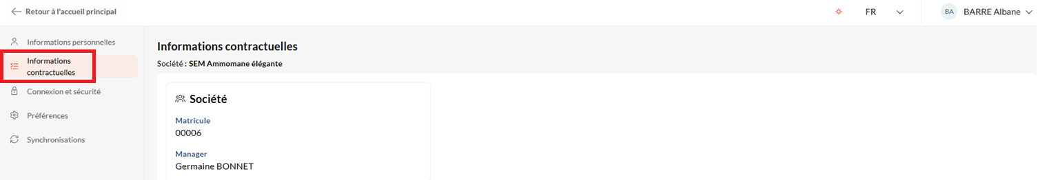 En cliquant sur son nom et prénom en haut à droite, le salarié peut accéder et gérer les informations de son compte :