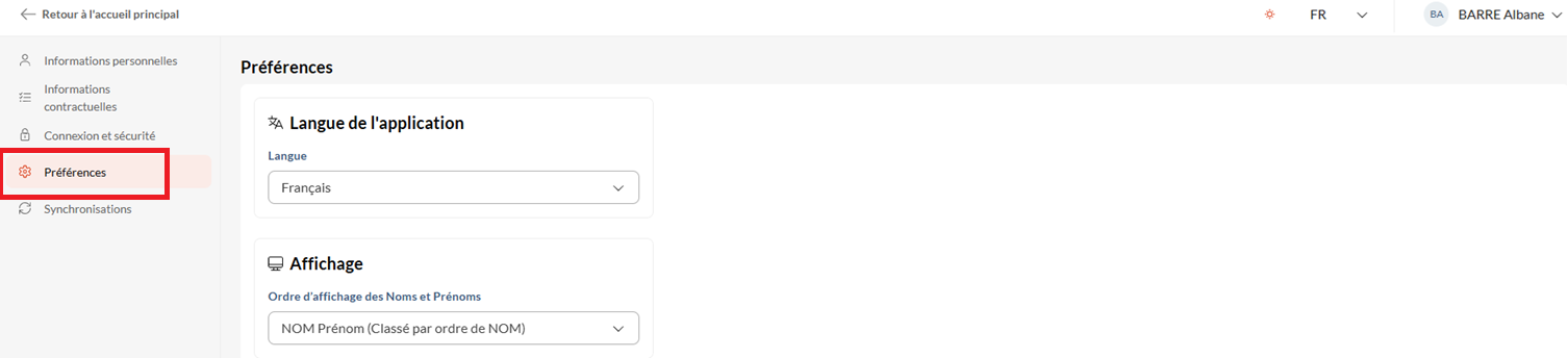 3. A partir de menu Préférences, le salarié peut choisir la langue de son application et l'ordre d'affichage de son nom et prénom (NOM prénom ou Prénom NOM) sur l'agenda :