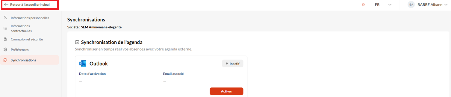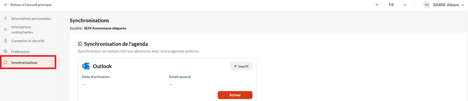 4. A partir de menu Synchronisations, le salarié peut choisir d'activer la synchronisation de ses absences avec son agenda Outlook. (Non rétroactif par rapport à la date d'activation) :