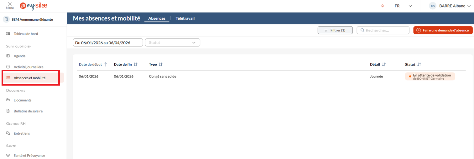 Le menu "Absences et mobilité" permet de consulter le récapitulatif de ses demandes d'absences. Le salarié a la possibilité de filtrer ses demandes par dates ou par statut (validé, annulé, supprimé, en attente de validation ou en attente d'annulation).