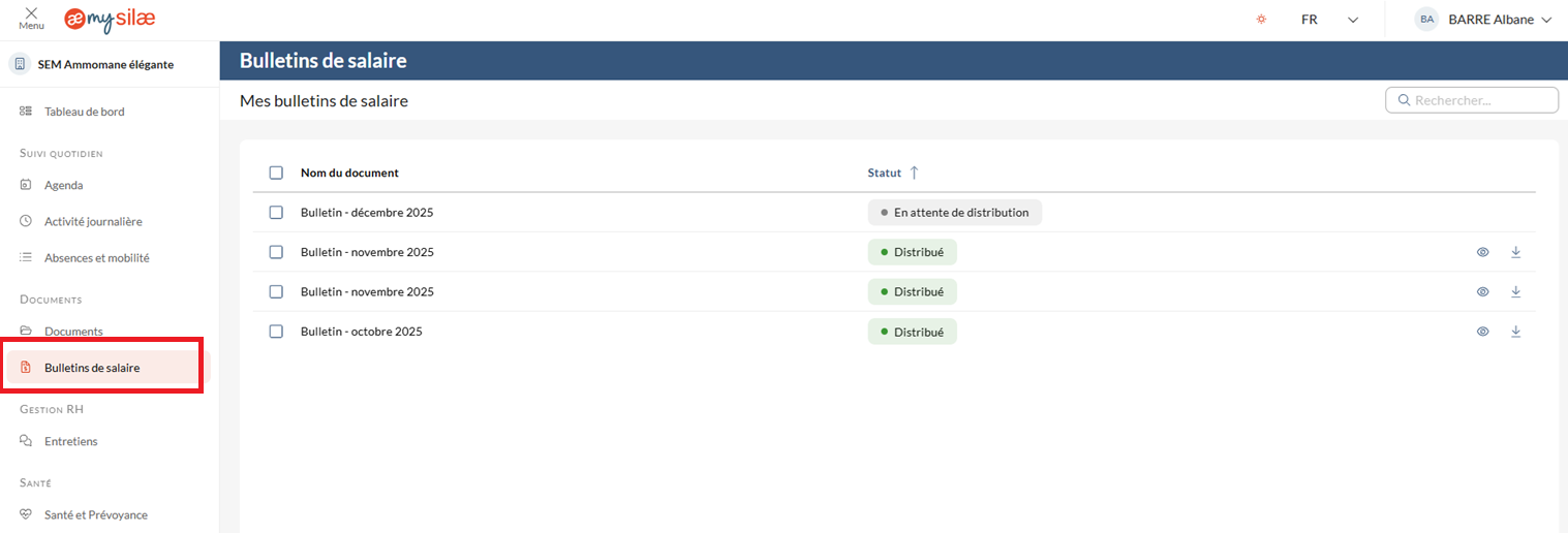 Exemple : Si la transmission des bulletins de salaire n’a pas été sélectionnée dans la gestion de My Silae, le salarié ne verra pas son dernier bulletin de paie dans la partie "documents".