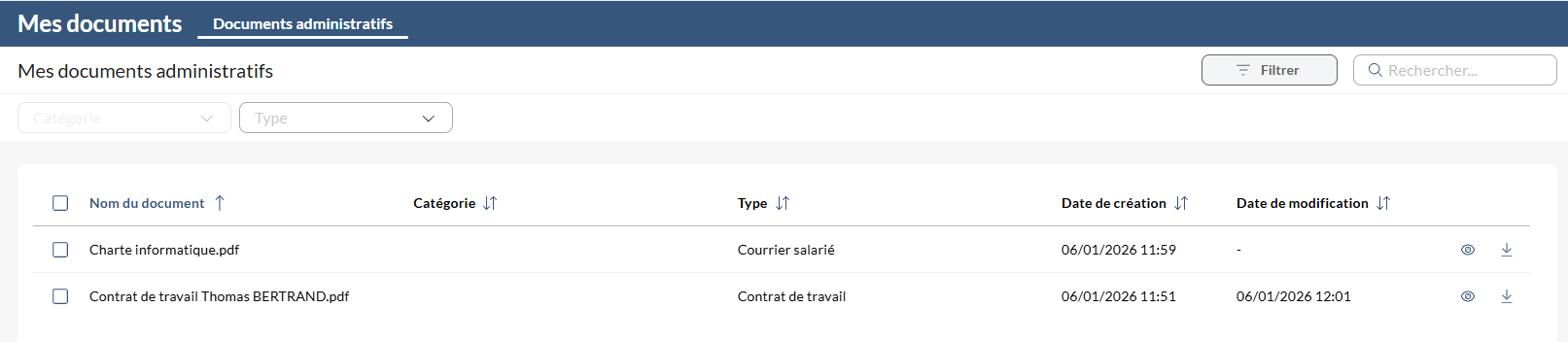 Le salarié accède à ces documents en cliquant dans la rubrique "Documents" > "Documents administratifs"