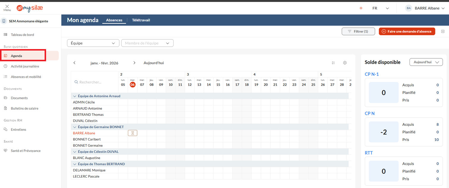 Le menu "Agenda" permet de consulter son agenda personnel, consulter ses compteurs de congés et faire une simulation jusqu'à 12 mois dans le futur.
