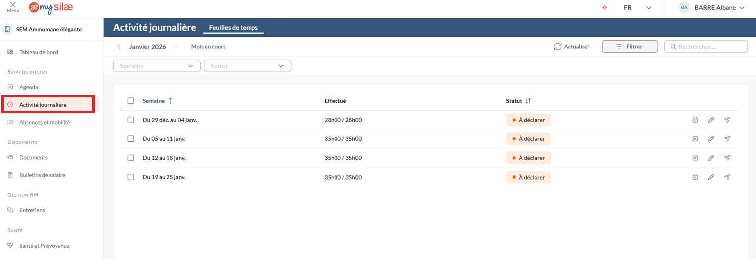 Le menu "Activité journalière" permet de déclarer le temps de travail effectué si le contrat de travail le prévoit. Le salarié a la possibilité de filtrer ses feuilles de temps par semaine et/ou par statut (A déclarer, En attente de validation, Validé).