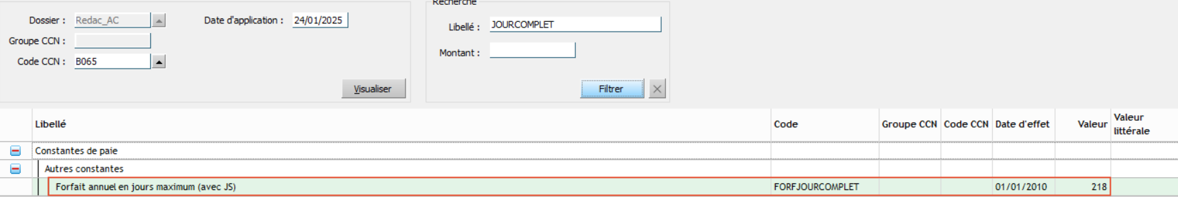 Pour les cadres au forfait jours inférieur à 218 jours, le montant particulier FORFJOURCOMPLET peut être modifié pour qu'ils soient comptabilisés pour 1 (menu Paramétrage > Montants particuliers > Montants particuliers applicables au dossier) :