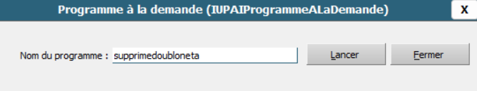 Supprimer les doublons en passant par le programme à la demande (menu Outils > Programme à la demande).