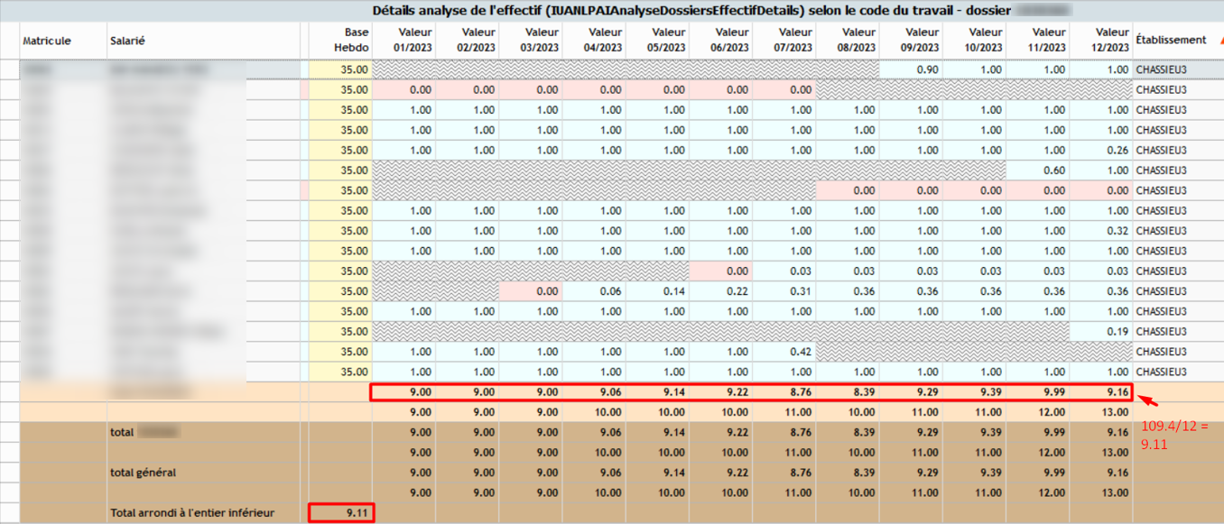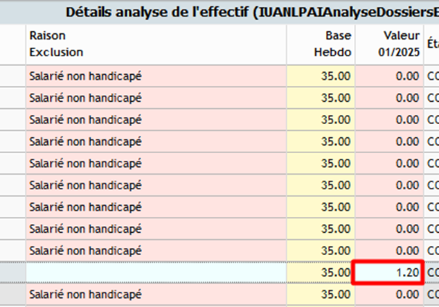 Exemple : Un salarié de plus de 50 ans a une grille horaire de 121.33 heures. Le calcul suivant est alors effectué : 121.33 / 151.67 * 1.5 = 1.19999 arrondi 1.2 dans l'effectif.