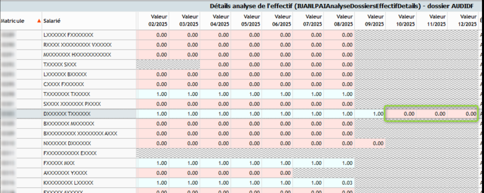 Exemple avec un salarié en CDD ayant quitté l'entreprise au mois de mars. En procédant à une analyse pour la période de novembre, ce salarié apparaît toujours. Cela s'explique par le fait que l'effectif d'un mois M doit inclure les CDD présents au cours des 12 mois précédant ce mois M (c'est-à-dire les CDD de M-1 à M-12), indépendamment de leur date de sortie.