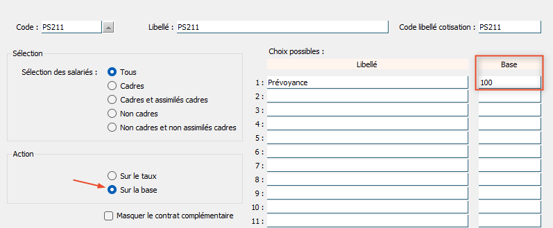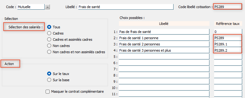 - La cotisation et le contrat complémentaire ont été créés, assurez vous que les informations sont renseignées correctement (code libellé, sélection des salariés, choix action sur taux ou action sur base) :