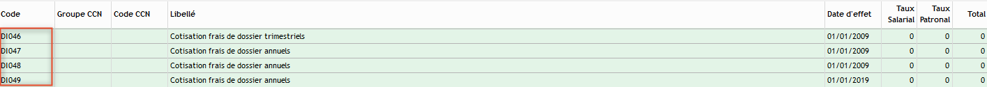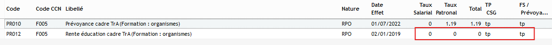 Se rendre dans le menu Paramétrage > Cotisations > Taux. Si le taux a été mis à zéro ou qu’il apparait avec un autre taux, cela signifie qu’il a été neutralisé ou modifié manuellement.