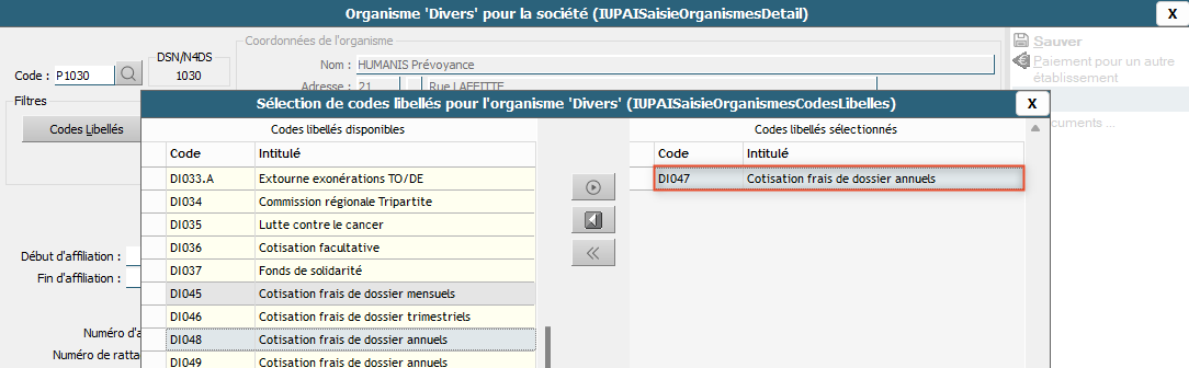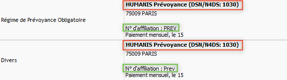 Cet organisme doit correspondre à celui déjà présent en nature RPO, ou RPS ou GRS. Indiquer le même numéro d'affiliation afin de gérer cette nouvelle cotisation via la fiche de paramétrage DSN de l'organisme attendu.