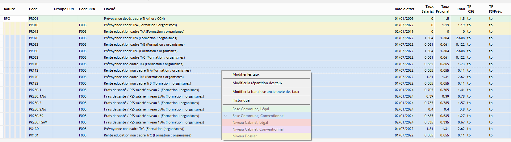 Dans le menu Paramétrage > Cotisations > Taux applicables au dossier :