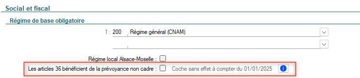 Cas des Article 36 : Depuis le 01/01/2025, si le salarié a été paramétré avec le statut catégoriel "02 - Article 36", alors, par défaut, ce sont les cotisations "Non cadres" qui s'appliquent. Un message d'alerte apparaît sur le bulletin et invite à faire un choix selon la volonté de l'entreprise. Dans le champ "Code statut régime protection sociale", choisir entre : "01 - Cadre et assimilé" et "04 - Non cadre".