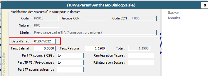 - Si vous avez modifié le taux via le menu Paramétrage > Cotisations > Taux et que la date d’effet n’a pas été correctement renseignée :