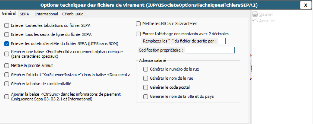 Dans ce cas, se rendre dans la fiche Société (section Informations bancaires). Dans les Options Techniques, cocher la case "Générer une balise uniquement alphanumérique (sans caractères spéciaux)" :